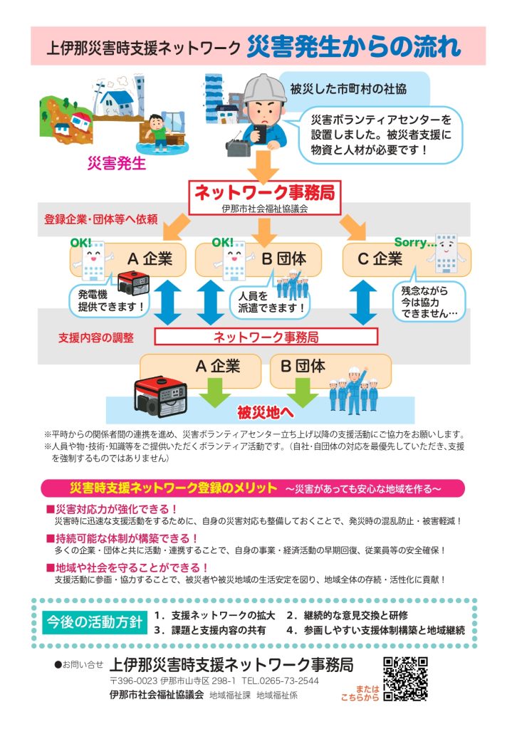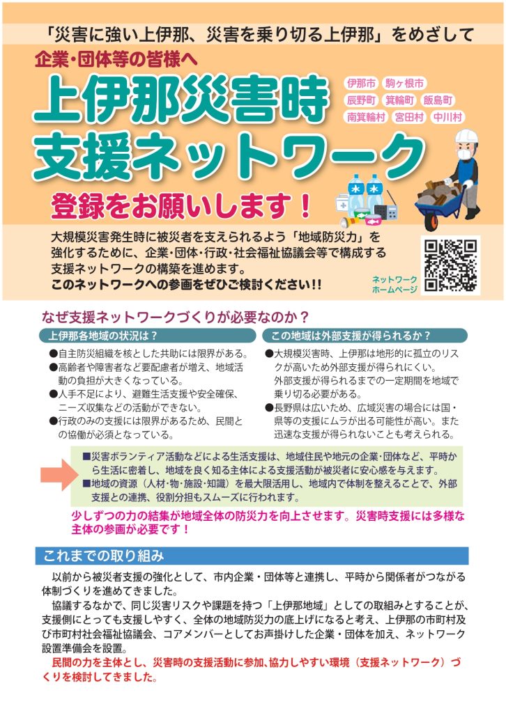 2025年9月より当団体は、大規模災害発生時に被災者を支えられる地域防災力を強化するために、企業・団体・行政・社会福祉協議会等で構成する支援ネットワークである「上伊那災害時支援ネットワーク」に登録しました。