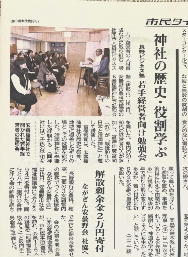第18回となる長野ビジネス塾セミナーでは、ゲストスピーカーに宮澤佳廣宮司様をお迎えし、安曇野市玄蕃稲荷神社にて「戦後80年の日本と靖国神社」と題して、正式参拝と宮澤宮司様による講演会を開催しました。